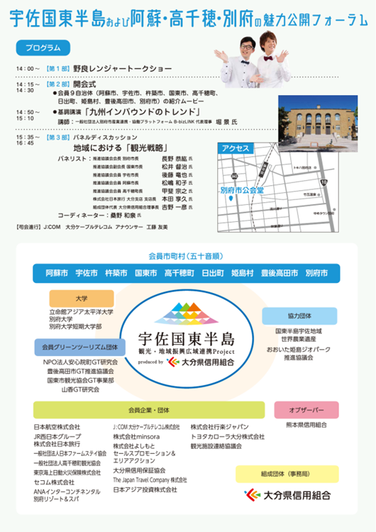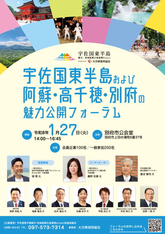 大分県信用組合が組成団体である、宇佐国東半島観光・地域振興広域連携Projectにて「宇佐国東半島および阿蘇・高千穂・別府の魅力公開フォーラム」を開催します。
