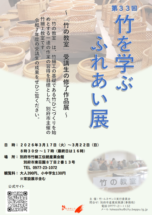 竹を学ぶふれあい展は、別府市竹細工伝統産業会館で開催している「竹の教室」の受講生が、一年間学んだ成果を発表する展示会です。別府竹細工の技術を習得した受講生の作品をぜひご鑑賞ください。