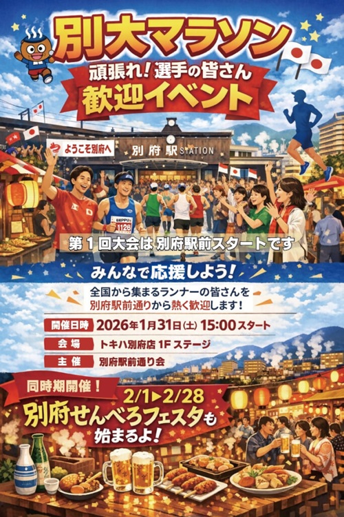 みんなで応援しよう!全国から集まるランナーの皆さんを別府駅前通りから熱く歓迎します!