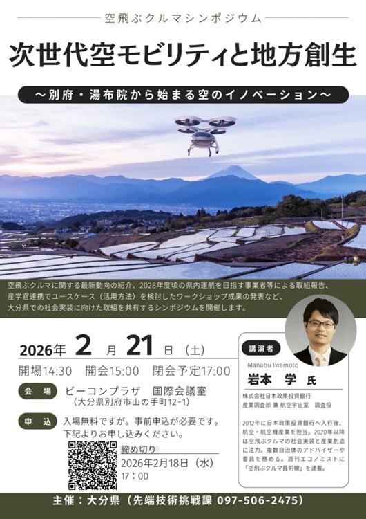 大阪・関西万博でデモフライトを行った次世代の空飛ぶ乗り物である「空飛ぶクルマ」について、最新動向や大分県での活用を考えるシンポジウムを開催します。