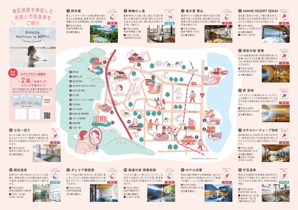 「別府美肌湯めぐりガイド」を片手に、美肌泉質が異なる温泉を巡りませんか。先着で(株)ポーラのスキンケアセットがもらえるスタンプラリーを実施します。