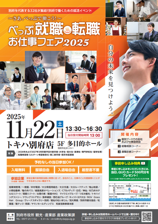 ・別府市でお仕事を探している方、インターンシップに参加したい方など