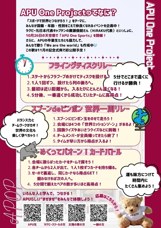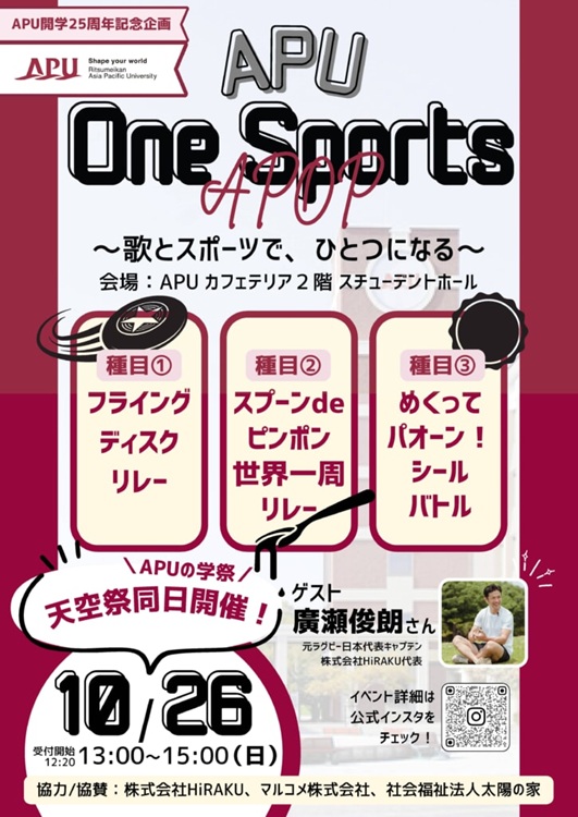 APU開学25周年を記念して、10月26日(土)に学生と地域の皆さまが“スポーツを通して交流できるイベント”を開催します。