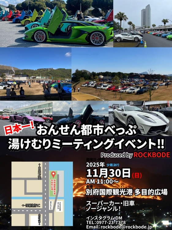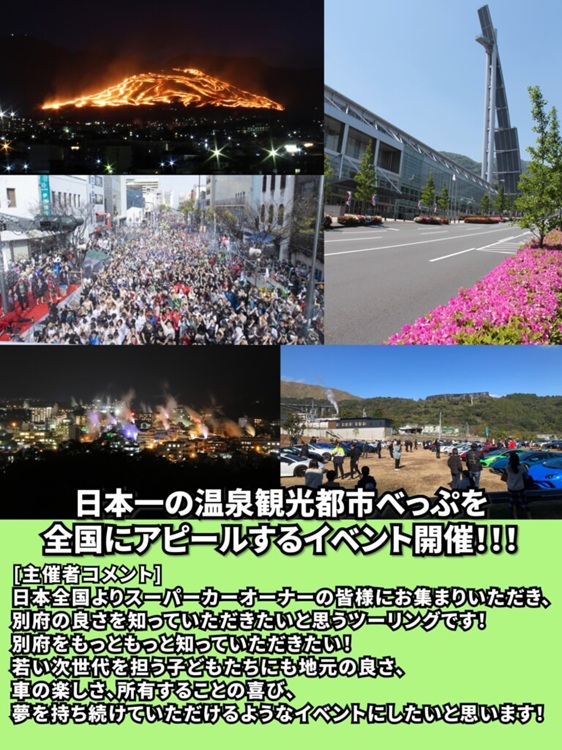 日本全国よりスーパーカーオーナーの皆様にお集まりいただき、別府の良さを知っていただきたいと思うツーリングです!別府をもっともっと知っていただきたい!若い次世代を担う子どもたちにも地元の良さ、車の楽しさ、所有することの喜び、夢を持ち続けていただけるようなイベントにしたいと思います。