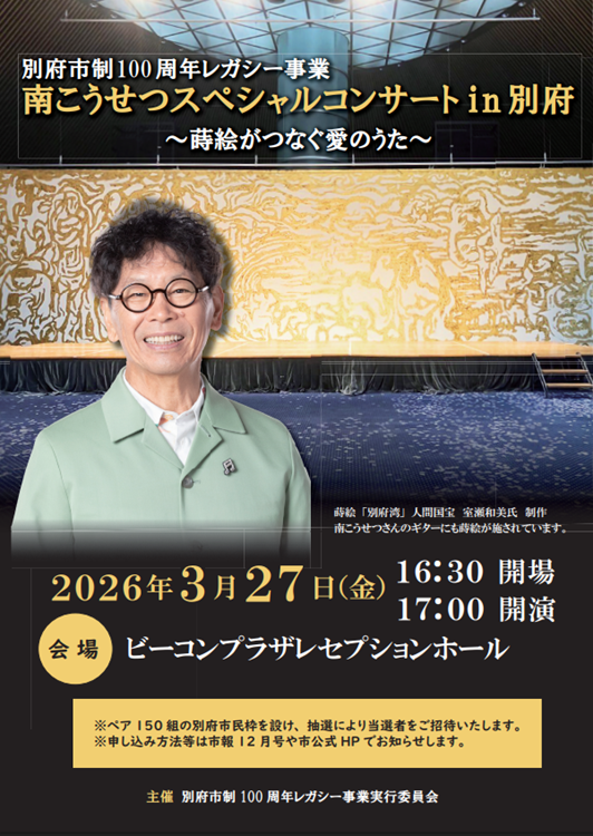 ビーコンプラザレセプションホールにある蒔絵「別府湾」は、重要無形文化財保持者(人間国宝)の室瀬和美氏が、大分県出身の日本画家高山辰雄氏とともに1998年に制作した蒔絵で、歴史的・文化的な遺産として将来に引き継ぎ、その価値を次代に伝えていくべき貴重な作品です。南こうせつさんは大分県ゆかりのアーティストで、室瀬和美氏がこうせつさんのギターに蒔絵を施すなど室瀬氏とも深い親交があります。