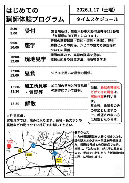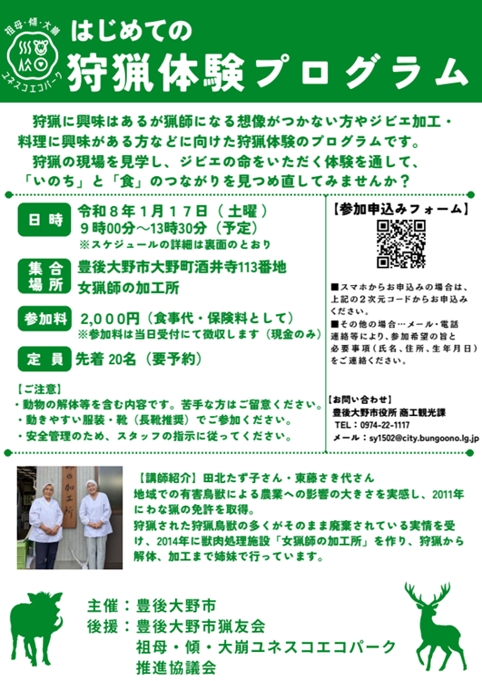 豊後大野市南部の祖母・傾山地域では、ニホンジカの生息密度が非常に高く、適正頭数の10倍以上が生息しているといわれています。その影響により、貴重な植物や森林、林業に深刻な食害が発生しており、地域の自然環境に大きな課題をもたらしています。こうした背景を踏まえ、狩猟やジビエ加工に興味・関心のある方を対象に、初心者向けの狩猟体験プログラム「はじめての猟師体験プログラム」を開催します。狩猟の現場に触れながら、地域の自然と向き合う貴重な機会です。ぜひご参加ください。