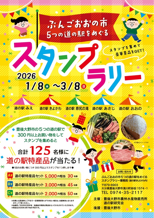 豊後大野市内の5つの道の駅で300円以上お買い物をして5駅分のスタンプを集めると、抽選で合計125名様に道の駅の特産品セットが当たります!
