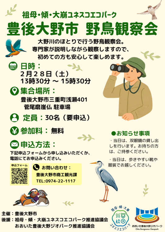 ユネスコエコパークに認定されている豊後大野市の豊かな自然環境を体験する企画として、野鳥観察会を実施します。初めての方でも、道具の貸し出しと専門家の説明を受けながら観察することができますので、お気軽にご参加ください。