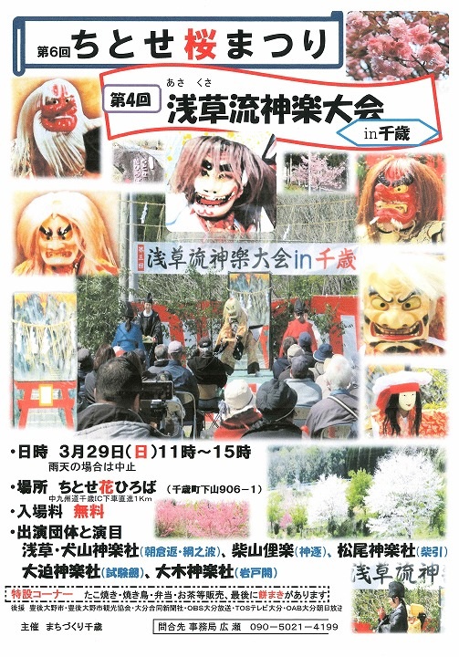 3月29日(日)11時~15時まで、千歳町下山の「ちとせ花ひろば」で、「第6回ちとせ桜まつり・第4回浅草流神楽大会in千歳」が開催されます。