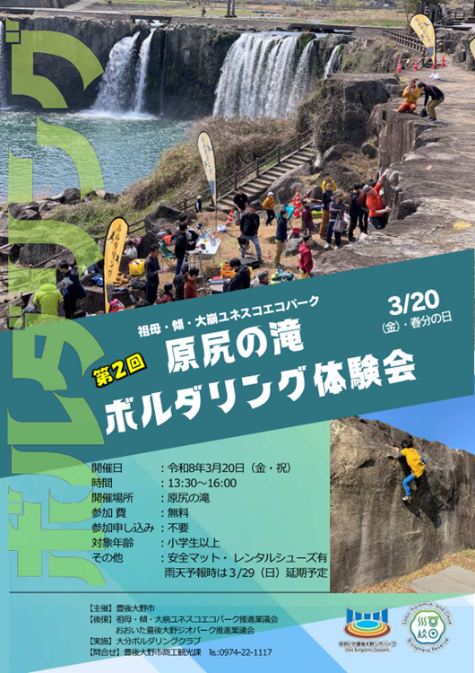 祖母・傾・大崩ユネスコエコパークの関連イベントとして、原尻の滝そばの岩壁を登る自然体験イベント「原尻の滝 ボルダリング体験会」を行います。