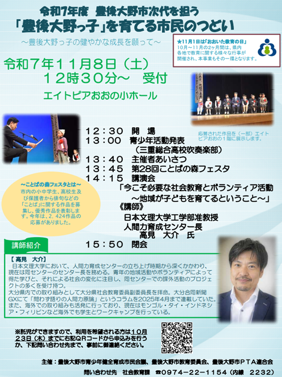 豊後大野市の児童・生徒の健やかな成長を願い、学校・家庭・地域が連携して、活力と実行力のある青少年健全育成活動へと発展させるため、標記つどいを開催します。