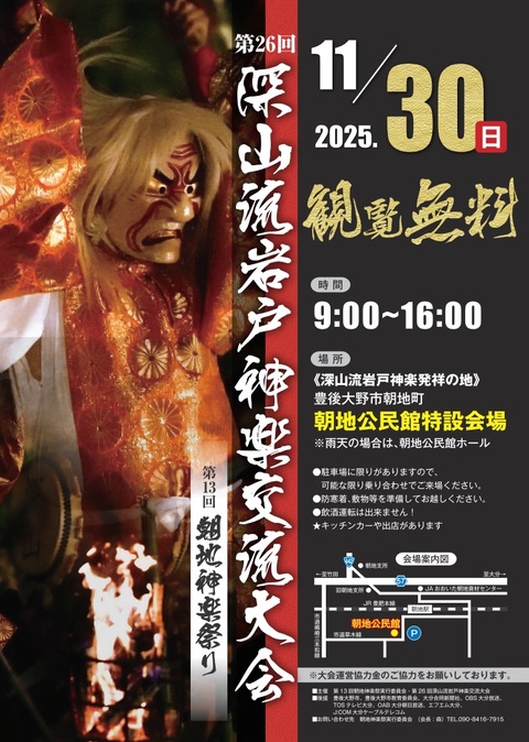大野系岩戸神楽の一つ、深山流発祥の地である朝地町で、深山流を継承する深山流朝地神楽保存会、板井迫神明社神楽座を中心に行われる朝地神楽祭りです。今回は、第26回深山流岩戸神楽交流大会と共催で、県下の深山流神楽を継承する9団体が一堂に会する神楽祭りとなります。勇壮で軽快な舞をぜひ会場でご覧ください。
