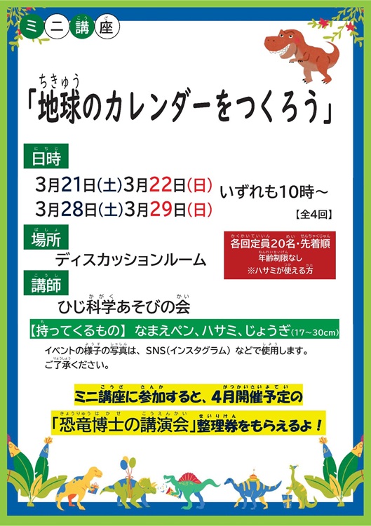 ★ミニ講座に参加すると、4月開催予定の「恐竜博士の講演会」整理券をもらえるよ!