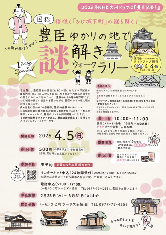 日出藩は、豊臣秀吉の正室(ねね)の甥にあたる木下延俊が慶長六年(1601)に入封して以来、木下家が十六代二百七十年の長きにわたって治めていた、豊臣ゆかりの海の城下町です。ひじ城址の美しい桜並木を愛でながら、豊臣ゆかりの地に眠るお宝を探します。