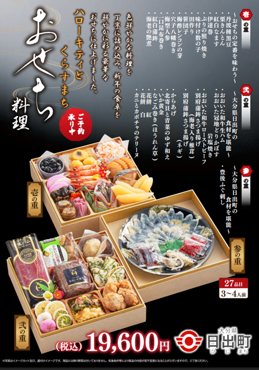 日出町では今年、事業者さんと共同で特製おせち料理を開発しました!地元食材をふんだんに盛り込み、世代を問わず楽しんでいただける内容となっています。多くの方にこの『日出町特製おせち』をお楽しみいただくために、今年は期間限定で受注販売をいたします!ぜひこの機会にお申込みいただき、2026年新春を『日出町特製おせち』と共にお迎えください!