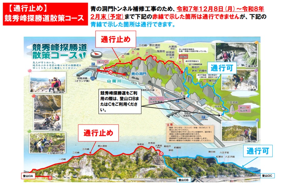 2025年12月8日月曜日から工事のため、青の洞門は山国川下流の樋田側の交差点から全面通行止め(歩行者も通れません)となります。これに伴い、競秀峰探勝道散策コースにつきましても、一部区間において次のとおり通行止めとなります。