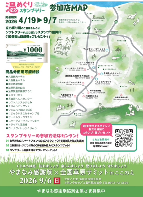 スタンプラリーの開催期間は4月19日(日)~9月7日(月)で、「九重・飯田高原観光協会」LINE公式アカウントの友だち登録から参加できます。ぜひ、ご参加ください。