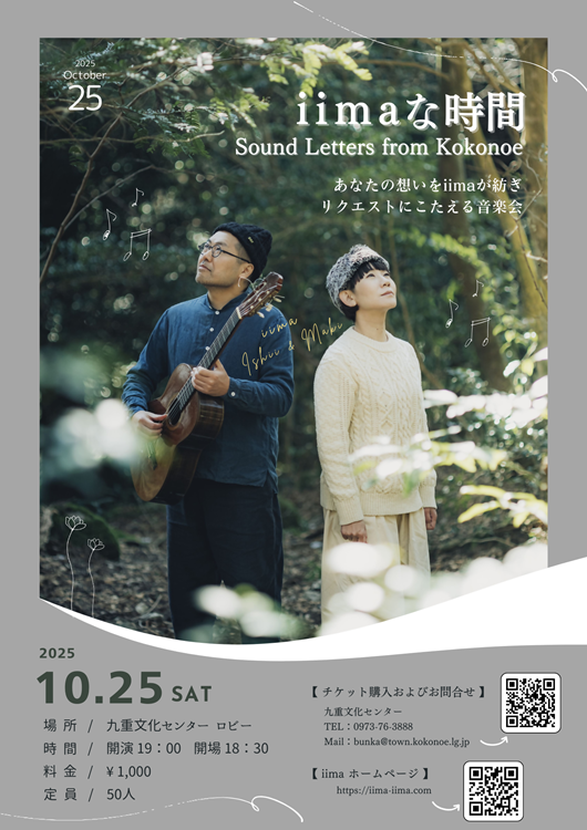 このたび、九重町の皆さんに向けて、福岡を拠点に活動する音楽ユニット iima(イーマ)をお迎えし、コンサートを開催します。やさしい歌声と透明感あふれる音の響きは、聴く人の心を温め、特別なひとときを彩ってくれることでしょう。