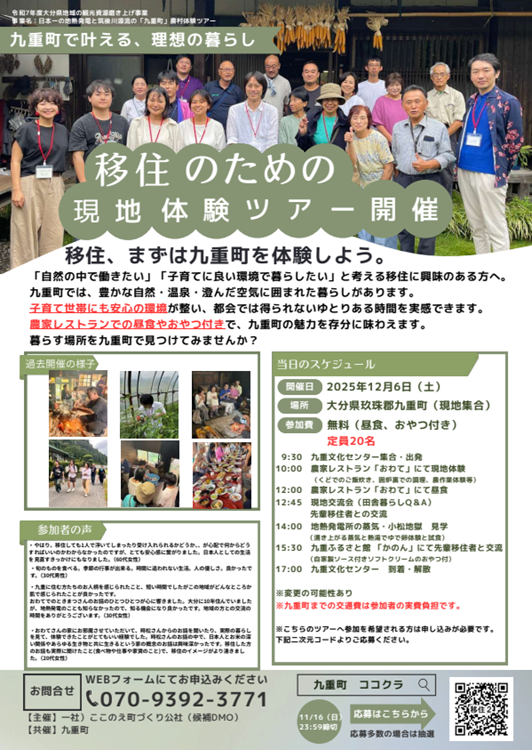 九重町に移住を考えている方を対象に農村体験ツアーを開催いたします。田舎暮らしが体験できる内容や地域住民との交流も予定していますのでこの機会にご参加ください!