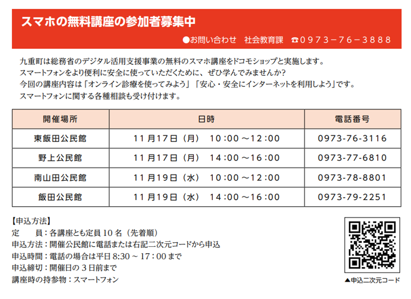 九重町では総務省のデジタル活用支援事業の無料のスマホ講座をドコモショップと実施します。スマートフォンをより便利に安全に使っていただくために、ぜひ学んでみませんか?