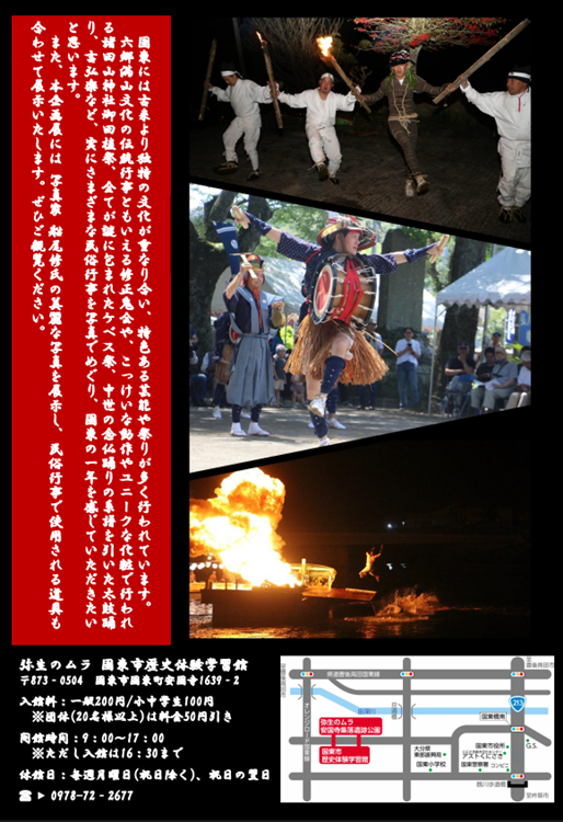 六郷満山文化の伝統行事ともいえる修正鬼会や、滑稽な動作やユニークな化粧で行われる諸田山神社御田植祭、すべてが謎に包まれたケベス祭、中世の念仏踊りの系譜を引いた太鼓踊り、吉弘楽など、実にさまざまな民俗行事を写真でめぐり、国東の一年を感じていただきたいと思います。本企画展には、写真家船尾修氏の美麗な写真を展示し、民俗行事で使用される道具もあわせて展示いたします。