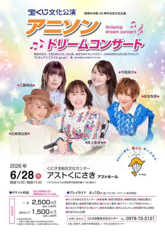国東市市制20周年記念文化公演として、宝くじ文化公演アニソンドリームコンサートを開催します。本公演は、「宝くじ」からの助成を受け、特別料金で実施するコンサートです。