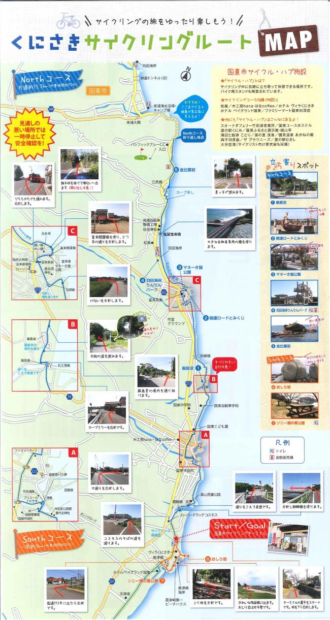 国東市では、自転車による市内散策や周遊を楽しむ観光客に対応するため、「くにさきサイクリングルートマップ」を作成し、配布しています。