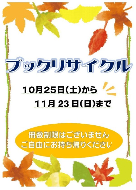 2025秋の読書週間に合わせて、10月25日(土)から11月23日(日)まで、国東市内の4図書館にて〈ブックリサイクル〉を行います。まだまだ使用に耐えうる本がありますので、ぜひ各町の図書館にご来館ください。思わぬ掘り出し物に出会えるかもしれませんよ。