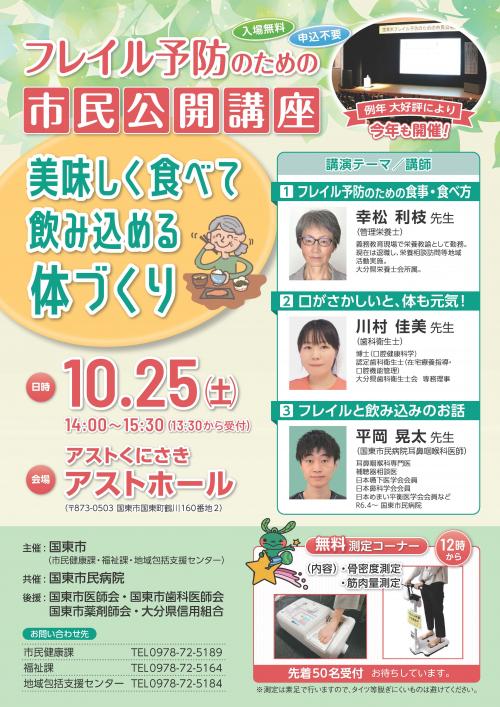 国東市の健康課題「フレイル(虚弱)」について、市民公開講座を開催いたします。多くの市民の皆さんのご来場をお待ちしています。フレイルの各分野(身体的・口腔・栄養)を専門にされている講師より、フレイルが起こってしまう原因やどうしたら予防できるか等について講演します。