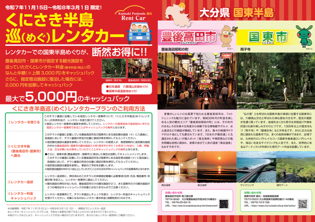 指定レンタカー営業所でレンタカーを借り受け国東市・豊後高田市が指定する観光施設を巡っていただくと、レンタカー料金の半額(上限3000円)をキャッシュバック!この機会にぜひ国東半島へお越しください!