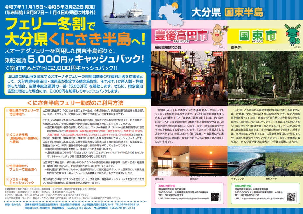 スオーナダフェリーを利用した国東半島巡りで、乗船運賃5000円がキャッシュバック!この機会にぜひ国東半島へお越しください!