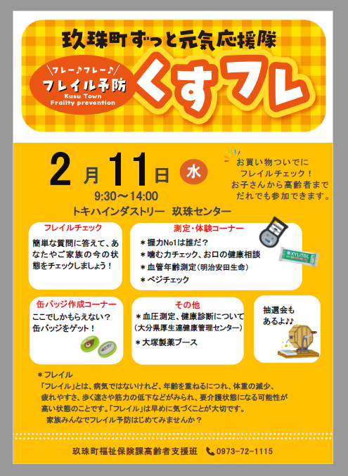 今回、健康寿命日本一おうえん企業などの協力のもと、お買い物ついでに楽しくフレイルチェックができるイベント「玖珠町ずっと元気応援隊くすフレ」~フレー♪フレー♪フレイル予防~を開催します。