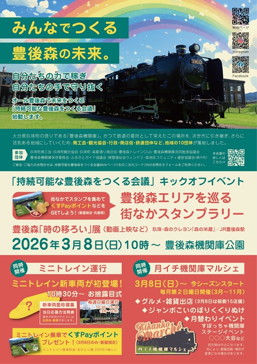 この度、3月8日(日)に豊後森機関庫公園にて、月イチ機関庫マルシェ と一緒に #持続可能な豊後森をつくる会議 キックオフイベントを開催します!