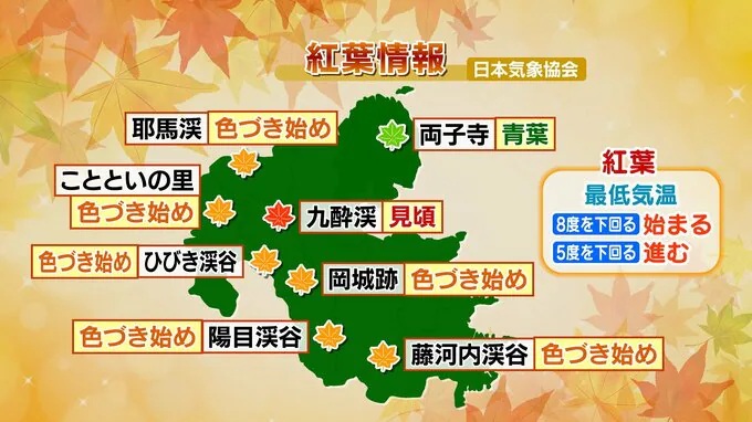 紅葉は最低気温が8度を下回ると始まり、5度を下回ると一気に進むと言われます。この先は冷え込む日が多く、山間部から平野部へと紅葉前線が降りていきそうです。