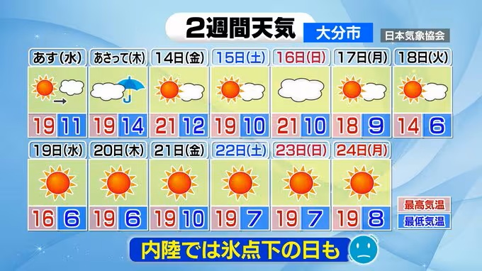 大分市の天気は11月15日(土)は晴れますが、11月16日(日)は雲が広がり、雨の降る所もありそうです。来週の3連休は晴れて、青空のもと紅葉狩りを楽しめそうです。