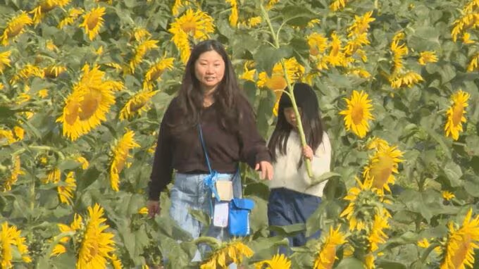 大分県中津市のコスモス園で、映画に合わせて植えられた季節外れのヒマワリが見頃を迎え、訪れた人たちを和ませています。