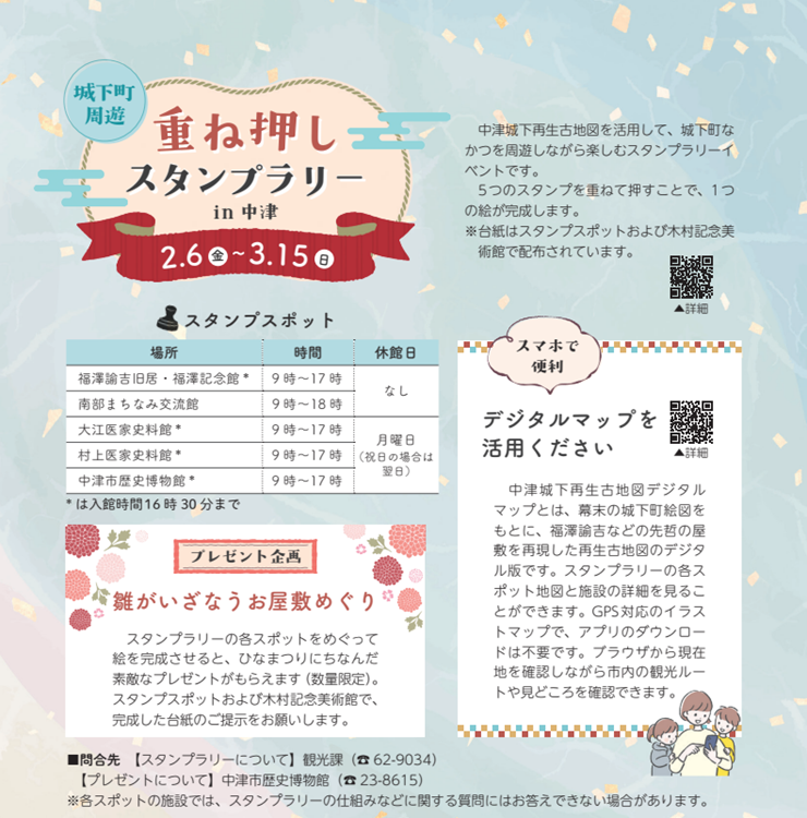 城下町なかつを周遊しながら、中津城下町再生古地図を活用して散策を楽しむスタンプラリーイベントです。5つのスタンプを重ねて押すことで、1つの絵が完成します。