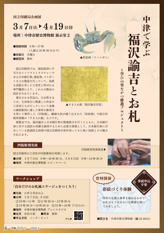 国立印刷局では、国民経済に不可欠なインフラストラクチャーである日本銀行券、諸証券、パスポートなどの製造を行っていて、高度な技能を有した工芸官と呼ばれる専門職員により、これらの製品の設計がされています。展示される作品は、大分県をはじめ、九州地方に関連した作品や工芸官たちがビュランという金属の細密彫刻に適した専用の彫刻刀を用いて制作した「凹版画」、繊細な技が盛り込まれた「彩紋画」や国立印刷局寄贈の「すき入れ紙」などです。展覧会では、福沢諭吉と日本銀行券の関連展示を行うとともに、日本銀行券に対する国民の信頼を維持するために必要な情報として、日本銀行券に付与している偽造防止技術や国立印刷局が長年培ってきた高い技術とその魅力を伝えます。