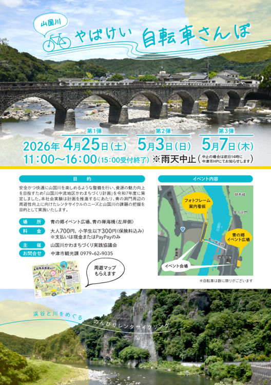 水辺を活かして地域の賑わいを創出する取り組み「かわまちづくり」を推進するため、かわまちづくり計画に基づき、平成30年度から山国川周辺を活性化する活動を行っています。今回はその取り組みの一環として、本耶馬渓町青地区でレンタサイクルなどの社会実験を行うこととなりました。