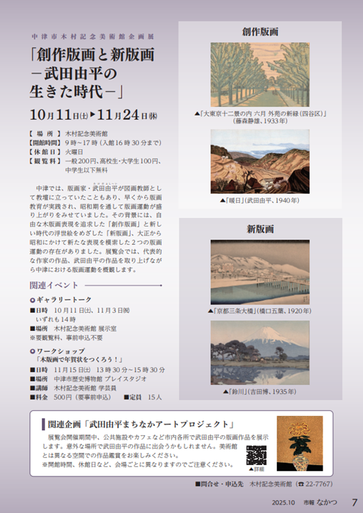 中津では、版画家・武田由平が図画教師として教壇に立っていたこともあり、早くから版画教育が実施され、昭和期を通して版画運動が盛り上がりをみせていました。その背景には、自由な木版画表現を追求した「創作版画」と新しい時代に浮世絵をめざした「新版画」、大正から昭和にかけて新たな表現を模索した2つの版画運動の存在がありました。展覧会では、代表的な作家の作品、武田由平の作品を取り上げながらな中津における版画運動を概観します。