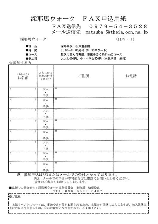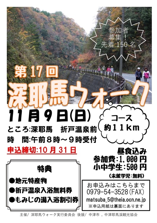 深耶馬折戸温泉前からスタートし、小柿山手前の広場で折り返す約11キロメートルに渡るウォーキングイベントとなります。8時から受付、9時から開会式が始まります。耶馬渓の季節の移り変わりを楽しめるイベントとなっており、完走後には地元の恵みたっぷりの昼食やお土産が用意されています。