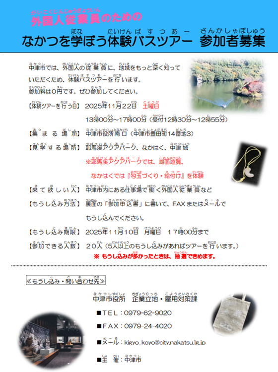 中津市内で働く外国人従業員を対象に、地域のことを深く知っていただくための体験バスツアーを 開催します。市内で働く技能実習生が中津のことをもっと好きになり、安心して楽しく生活 できるように、ツアーを通して中津の魅力を見学、体験していただきます。