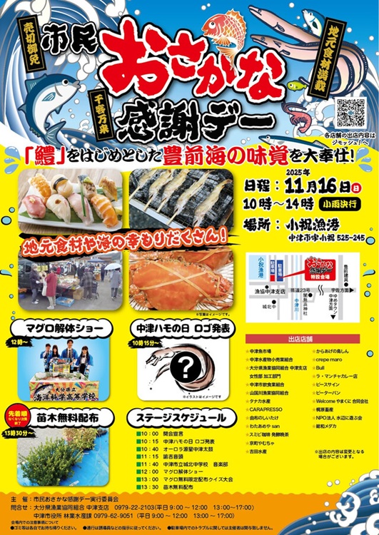 当日はステージイベントや屋台、キッチンカーなど盛りだくさんの内容となっています。ステージイベントでは、「中津ハモの日ロゴ発表」に始まり、「オーロラ源星中津太鼓」や「中津市立城北中学校音楽部による合唱」、大分県立海洋科学高校生徒による「マグロの解体ショー」が会場を盛り上げます。イベントの終盤には、マグロの無料限定配布クイズ大会や苗木の無料配布(先着順)もあり、最後まで楽しめるものとなっています。