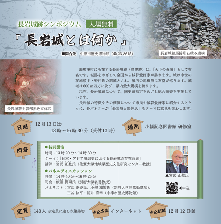 耶馬渓町に所在する長岩城跡(大分県史跡)は、「天下の奇城」として有名です。城跡をめざして全国から城郭愛好家が訪れます。城は中世の在地領主・野仲氏の詰城とされ、城内の尾根筋に石塁が巡ります。城域は600m四方に及び、大分県内最大規模を誇ります。現在長岩城跡について、国史跡指定をめざし総合調査を実施しています。長岩城の特徴やその価値について市民や城郭愛好家に紹介するとともに、各パネラーが「長岩城と野仲氏」をテーマに意見を交わします。