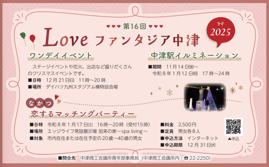 中津駅前洞門広場を中心に、美しいイルミネーションが冬の街を彩ります。また、12月21日(日)には、ダイハツ九州スタジアム横の特設会場にてワンデイイベントなども実施され、幻想的な夜のひとときを楽しめます。ぜひ足をお運びください。