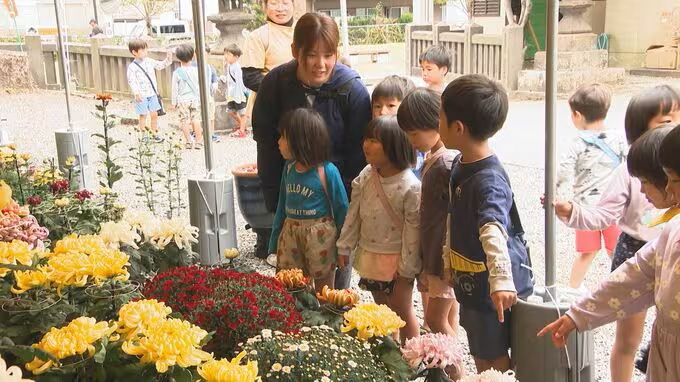 会場となっている大分市の若宮八幡社には、花卉同好会の会員32人が丹精込めて育てたおよそ400点の菊が展示されています。今年は猛暑の影響で厳しい栽培環境でしたが、まずまずの出来に仕上がっているということです。保育園の園児たちも会場を訪れ、菊の花を楽しんでいました。