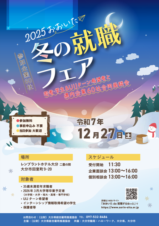 大分県内企業60社が参加する「2025おおいた冬の就職フェア」を開催します。