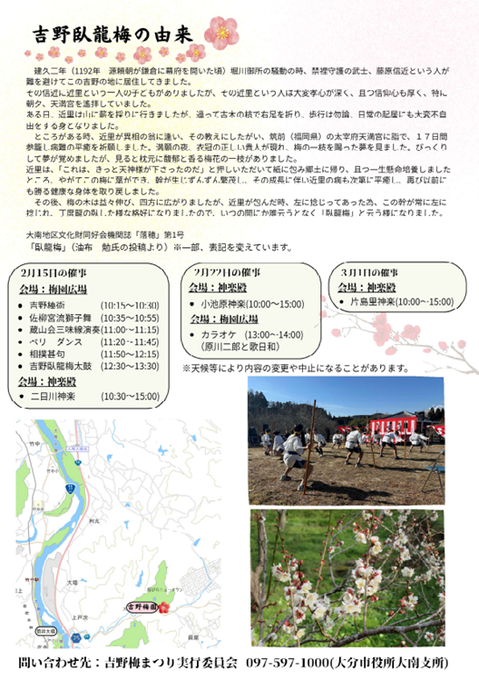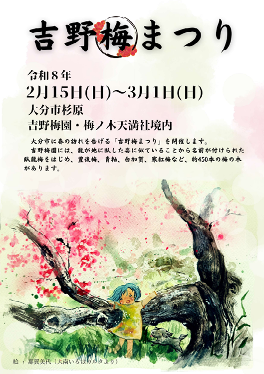 大分市に春の訪れを告げる「吉野梅まつり」を開催します。梅園に響く太鼓やお囃子をお楽しみください。