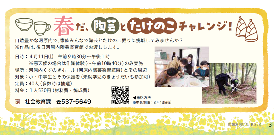 自然豊かな河原内で家族みんなで陶芸とたけのこ掘りに挑戦してみませんか