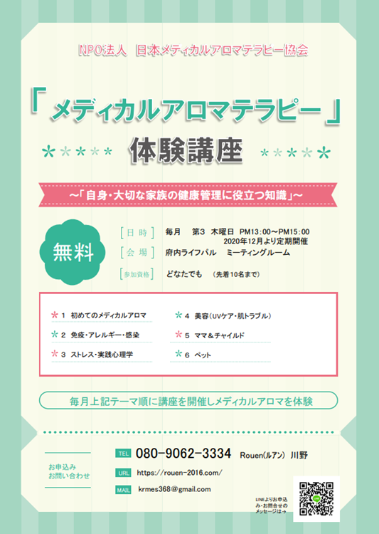 多くの人・ペットが健康な毎日を過ごせるように「アロマ」を使った安心・安全で正しい家庭での健康管理の仕方を普及させるために活動している「NPO法人日本メディカルアロマテラピー協会」が、メディカルアロマテラピーの体験講座を毎月第3木曜日にライフパルで開催しています。ぜひお越しください。